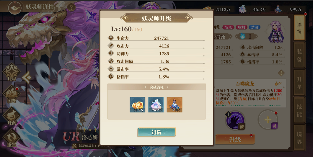 妖靈師可以通過(guò)消耗升級材料(妖晶幣、龍元靈液)提升等級,而升級可以提升面板屬性,當達到等級上限時(shí)可以通過(guò)消耗妖晶幣、龍元靈液和九轉丹進(jìn)階等級上限。不過(guò)前期資源有限,還是盡量避免將養成材料分散給太多角色,練好一隊主力隊伍能過(guò)主線(xiàn)才是最重要的。?