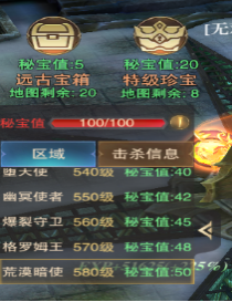 該BOSS玩法的進(jìn)入副本后也是擁有100點(diǎn)秘寶值,也是該游戲魂器以及魂器材料產(chǎn)出的唯一途徑,激活魂器能給與角色很大的屬性加成,建議開(kāi)啟該玩法后,每天都把次數刷完! 除BOSS以外,還有遠古寶箱和特級珍寶可供玩家采集,但采集寶箱也同樣需要消耗秘寶值,詳情可見(jiàn)下圖。且該副本的BOSS挑戰難度較高,擊殺會(huì )比較耗時(shí)。(PS:按照物品掉落的稀有程度,優(yōu)先級可以分為:副本BOSS≥特級珍寶>遠古寶箱)