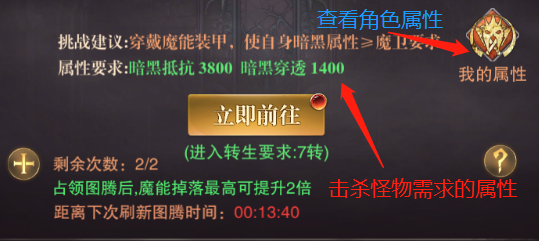 要擊殺副本中的怪物,需要滿(mǎn)足副本怪物的屬性要求,否則會(huì )被副本中的怪物“秒殺”。所以我們挑戰副本需要根據副本頁(yè)面右側的“我的屬性”一欄,查看角色的屬性值,來(lái)挑選副本中合適的怪物進(jìn)行擊殺,待滿(mǎn)足了下一層怪物的屬性要求后,再進(jìn)行前往挑戰。層數越高的怪物,屬性要求會(huì )越高?
